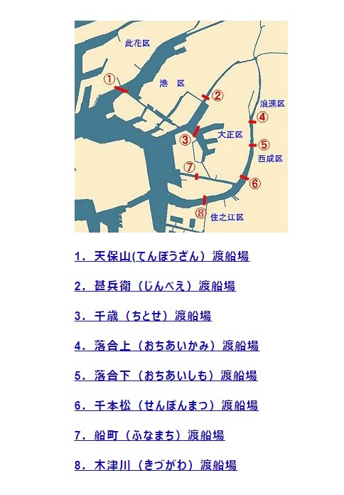 大阪市のホームページを確認すると、現在大阪市内には、市の運営する8か所の渡船場があり、15隻の船が地域の多くの人々に利用されているとのことです。